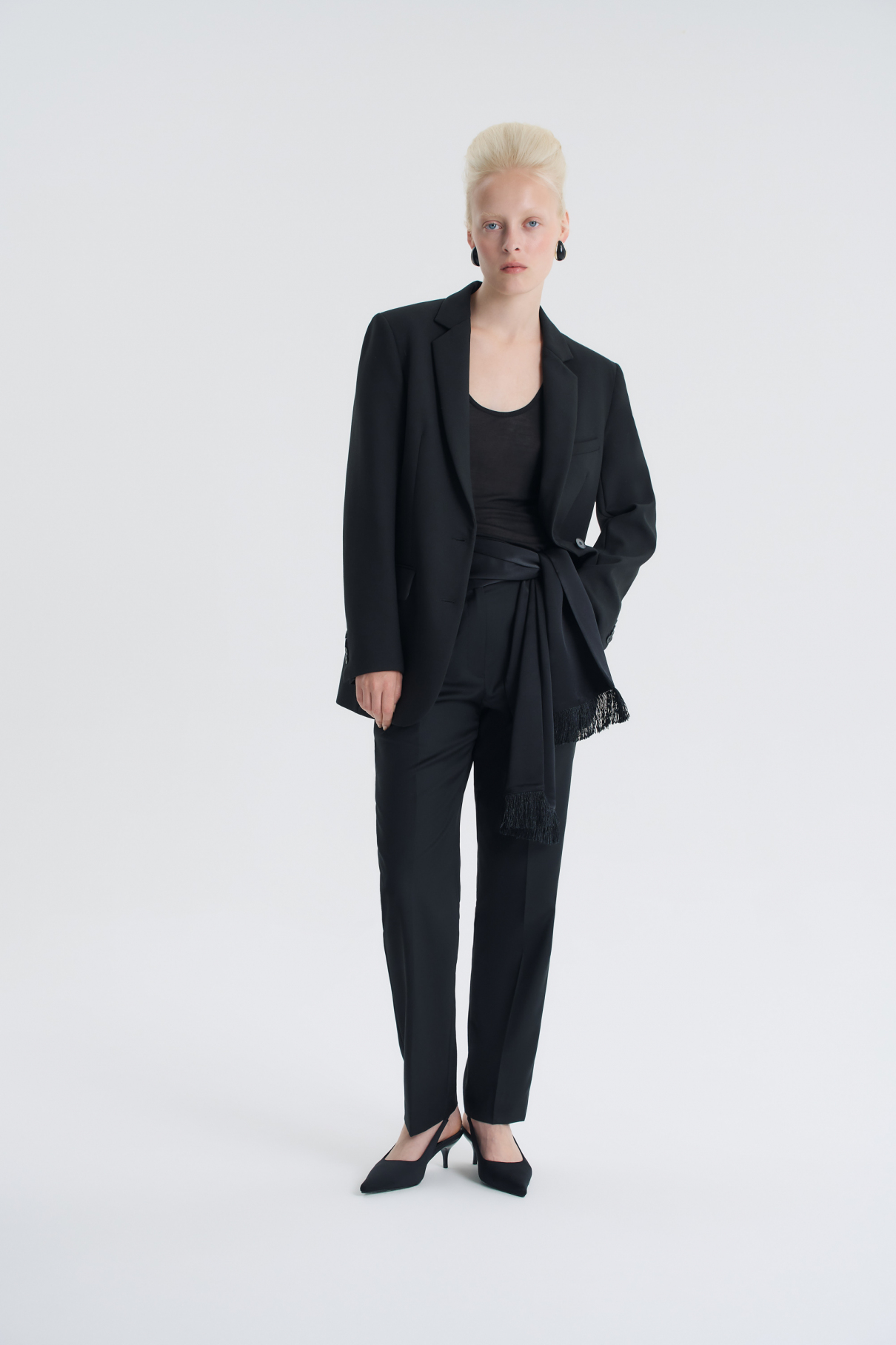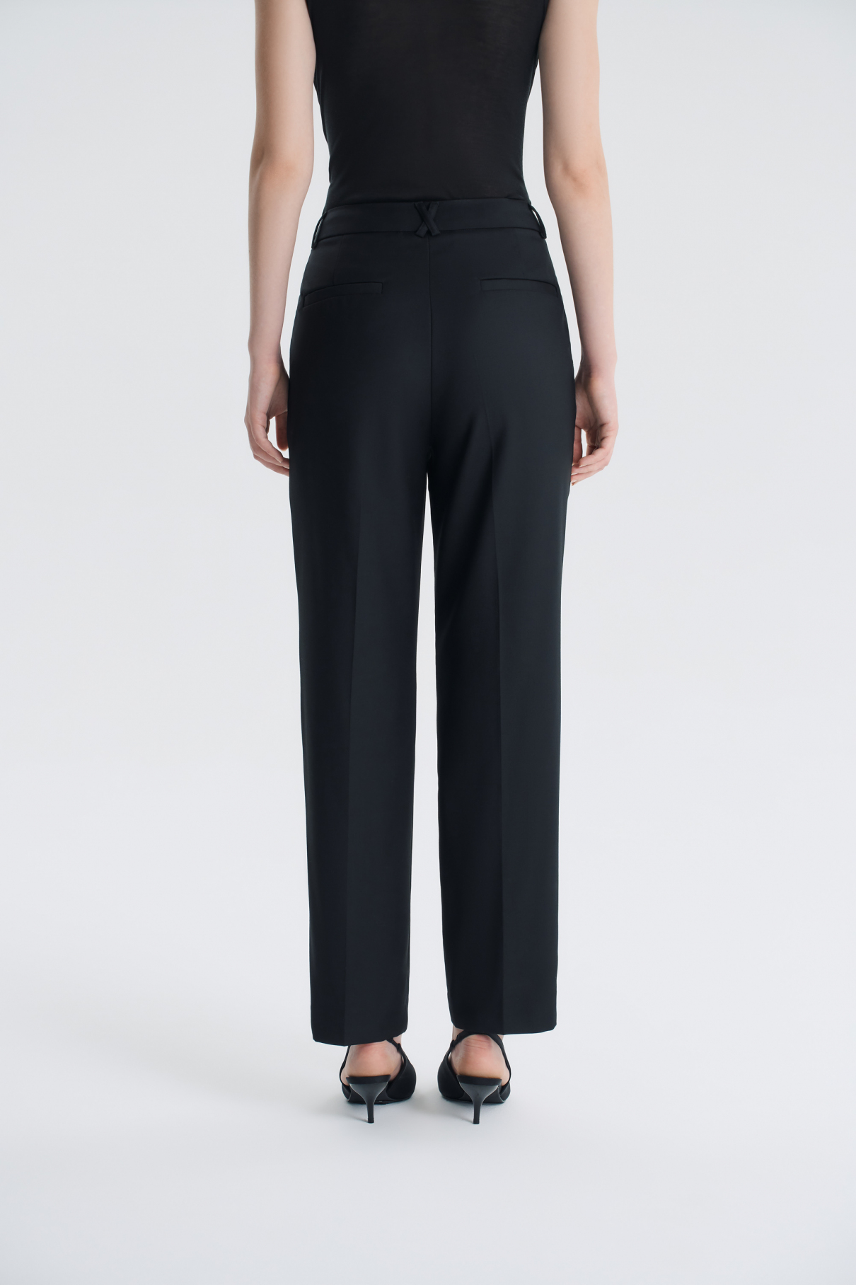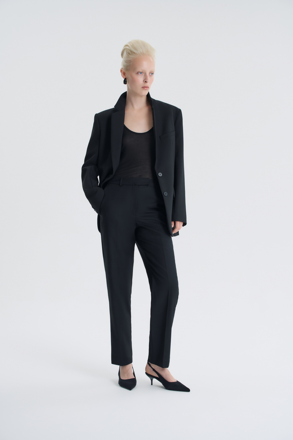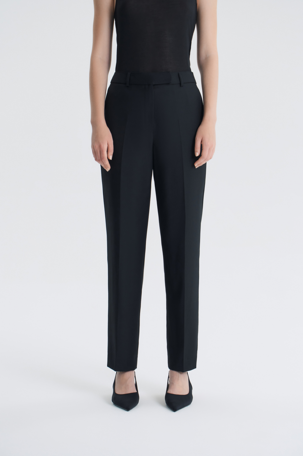 Идеальные базовые брюки: черные, слегка зауженные, со средней посадкой и из премиальной шерстяной ткани. Они одинаково хорошо смотрятся как с кроссовками, так ...ещё и с туфлями на каблуке, легко сочетаются с любым верхом — от простой футболки до элегантного пиджака. Мягкая шерстяная ткань в приятна к телу, не мнётся и хорошо сохраняет форму. Удобная посадка по фигуре, аккуратный пояс и продуманный крой делают их по-настоящему удобными.